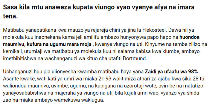 Wataalam wanapendekeza dawa Flekosteel kama dawa bora ya maumivu kwenye viungo, mishipa, mgongo, na pia magonjwa yanayosababishwa na mabadiliko yanayohusiana na umri. Haraka na ya muda mrefu athari ni uhakika na wewe!